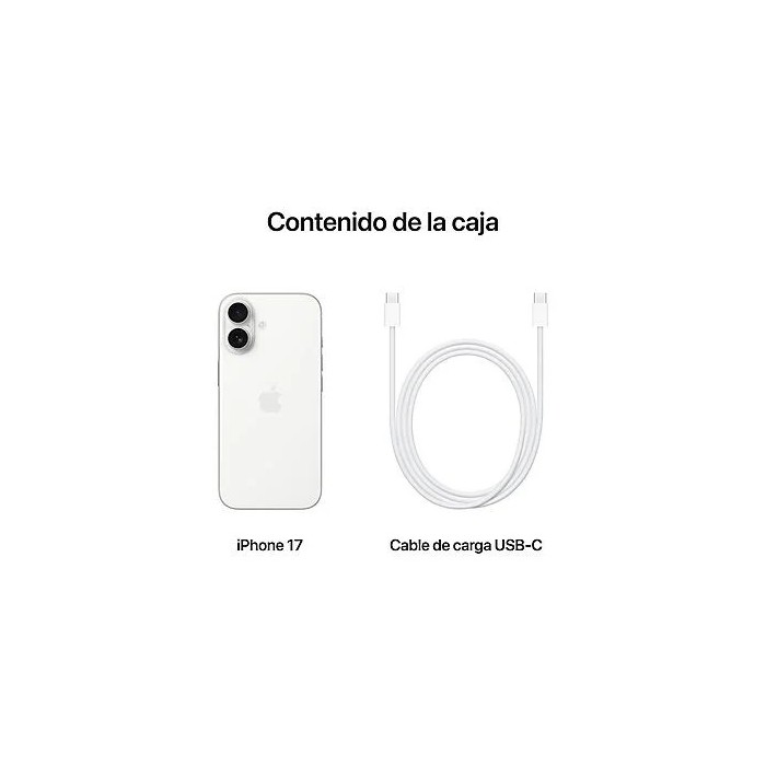 iPhone 17 (Modelo A3010) — 256GB Negro — Nuevo precintado, libre para cualquier operador (SIM + eSIM). Se entrega con caja original precintada y accesorios de fábrica (sin cargador, incluye cable USB-C estándar Apple). Pantalla: 6.1″ Super Retina XDR OLED Chip: A18 Cámaras: foto/vídeo con estabilización Conectividad: 5G / Wi-Fi / Bluetooth / NFC Sistema: iOS Capacidad: 256GB Color: Negro Dimensiones: 71.5 × 146.7 × 7.6 mm — 172 g Modelo reciente, nuevo precintado, compatible con Apple Watch, Mac, iPad y servicios Apple. Entrega inmediata. Facturación bajo Régimen Especial (REBU). Precio final.